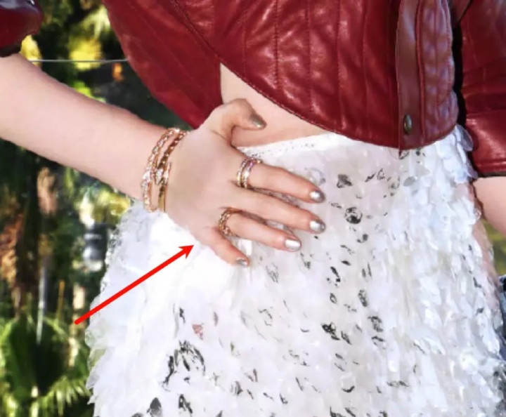而且仔细看精修图上,为了p掉她腰侧上的赘肉,小拇指的地方变成了波浪线。